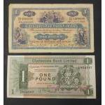 Scottish Banknotes x2 - CLYDESDALE BANK LIMITED £1 notes in good collectible grade. Minor blemishes but no major folds, rips, tears or penmarks. Includes rarer Wartime 'B' note in good grade with folds but no major flaws and a 1969 £1 in nice crisp condition.