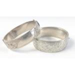 Two silver bangles one stamped SILVER TM the other carrying full hallmarks for Birmingham 1953. Both in good condition with working clasps. Total combined weight 75g approx.