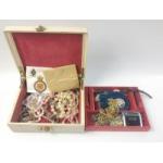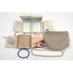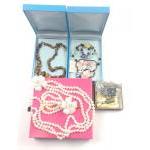 Two pieces of AURORA jewellery with SWAROVSKI ELEMENTS including a bracelet with string strap and a necklace with pendant 4cm long on a chain approx 46cm, plus a white metal BABYLONE, PARIS necklace with pearlescent stones 46cm approx, a blue bead elasticated bracelet by GIUESYTIC and a string of faux pearls approx 42cm