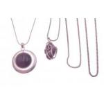 Four chains one stamped Italy 925, one stamped 925, one unmarked with polished agate stone, one unmarked white metal with a double ringed purple stone