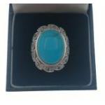 A silver ring, stamped 925, with turquoise coloured stone (2cm), surrounded by marcasite, Size P, gross weight 7.4g