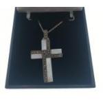 A silver chain, stamped 925, 42cm long, with a pendant cross, stamped 925 decorated in mother of pearl and marcasite (5cm long),gross weight 8.6g
