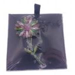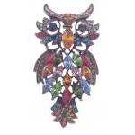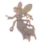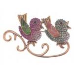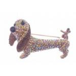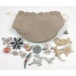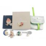 A small collection of blingish brooches to include a robin (4cm approx) by 'DM', an owl sitting on a crescent moon (4cm approx) by 'BJ', a small frog 3cm long (missing one eye) by 'A&S', a magnet-fastened Christmas tree (5cm long), a shiny tennis racquet and ball 6cm (one small stone missing), and a small bird by BILL SKINNER