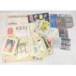 A folder crammed full of STAMP SETS and POST OFFICE picture card postcards including a 1976 UNITED STATES Postal Service set of Commemorative stamps, several UK stamp sets and two First Day Covers