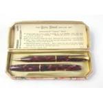 CONWAY STEWART DINKY 550 writing set in lovely original silk lined presentation box. Both pen and pencil in super deep maroon laquer finish. Both used but in excellent order.