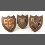 Three Armorial shield crests with tin centre pieces. May be OXFORD UNIVERSITY related. Each 32cm tall and in good order.