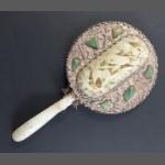 ANTIQUE CHINESE SILVER & JADE HAND MIRROR with Jadeite Gemstones In nice condition carved jade and silver hand mirror, with hand carved jade flora and fauna raised panel - with also a carved low relief dragon handle backed by silver on back of glass with flora relief. Underside of handle is silver, engraved with floral decoration, flanked by 2 shou symbols. Dimensions 22cm length x 12cm diameter approx