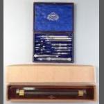 A boxed and lined draughtsman's drawing set made by MILLER'S Drawing Material Warehouse of Glasgow. Complete. Also a vintage ASTONMANDA wood and brass desk ruler dated 1944 38cm in length approx