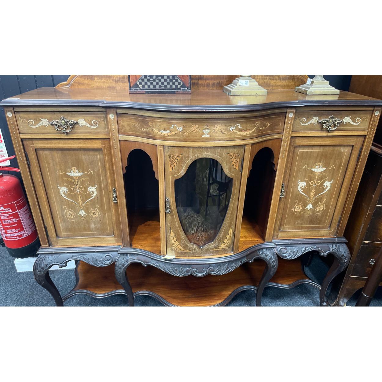 A stunning vintage centre bow-fronted sideboard, with bow legs and intricate dolphinesque inlay measures 110cmH x 137W x 50D
