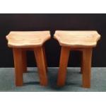 From the workshop of TIM STEAD. Two matched Elm Stools with shaped seat raised on four legs, each stamped to the underside with circular workshop stamp and marked Ross Purves 2010. 38cm wide x 30cm deep x 46cm high approx. A lovely pair of stools with nice patina and no damage.