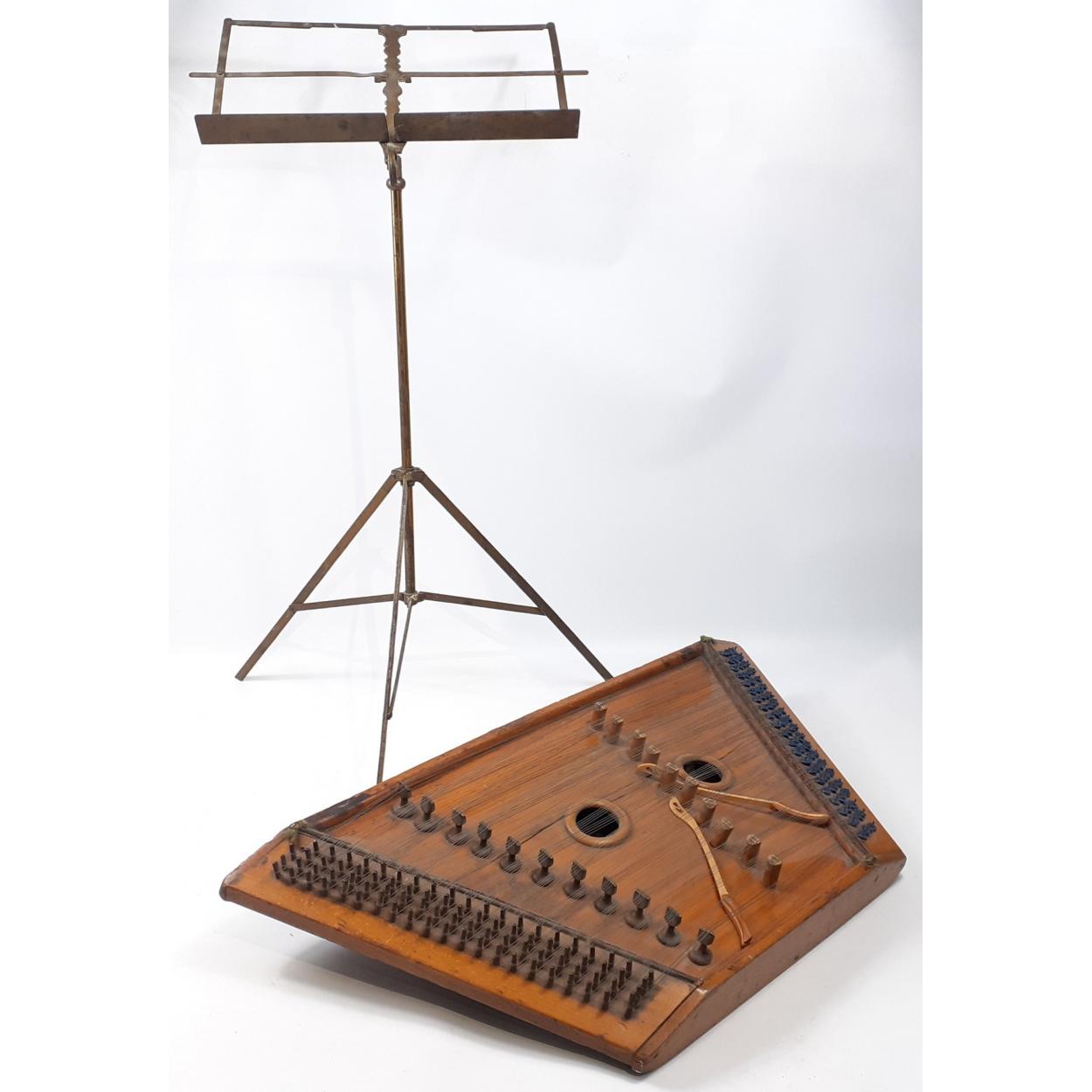 A vintage zither with some damage and signs of wear from storage, presented with a brass music stand.