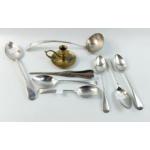 A selection of EP flatware to include glove stretchers, Walker & Hall ladle, a small brass candlestick etc.