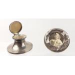 A beautiful small sterling silver fully hallmarked Capstan Inkwell. Hallmarks for London 1909. 6cm diameter approx and weighs 64g approx. Indistinct maker. Lot includes a very small and battered antique silver photo frame.
