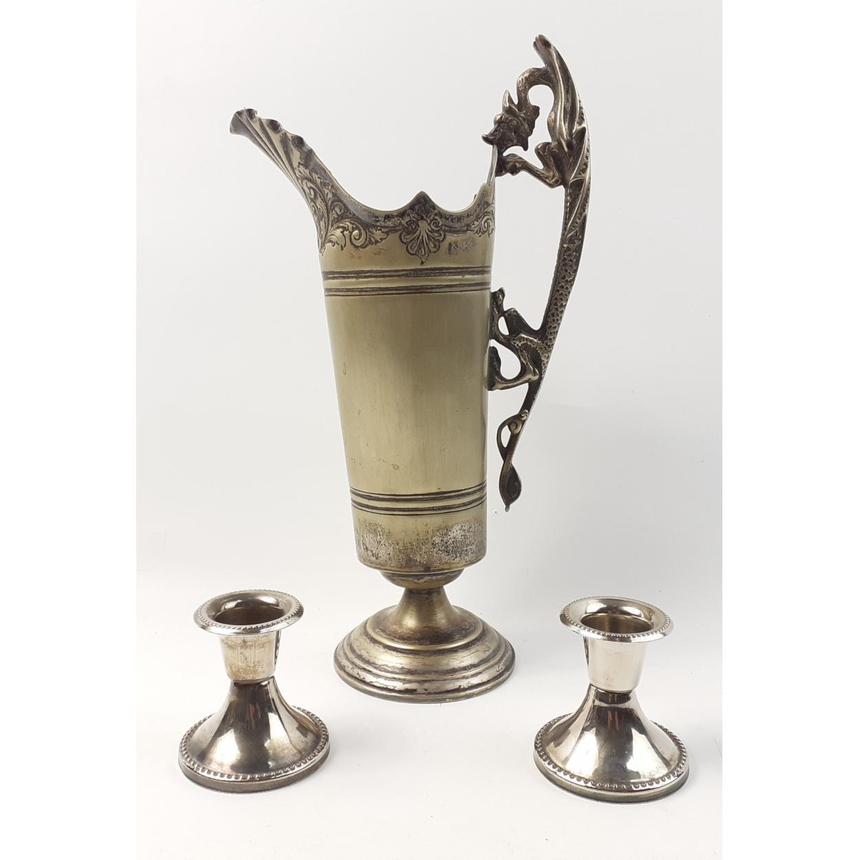 An ANTIQUE PEWTER jug dimensions 27cm tall x 10cm diameter approx - to include also two small plated candlesticks dimensions 6cm tall x 6cm diameter approx