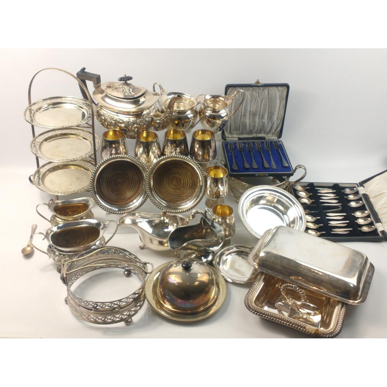 A mixed lot of silver plated flatware to include 6 goblets, a 3 piece tea service, coasters, serving dishes, cake stand etc