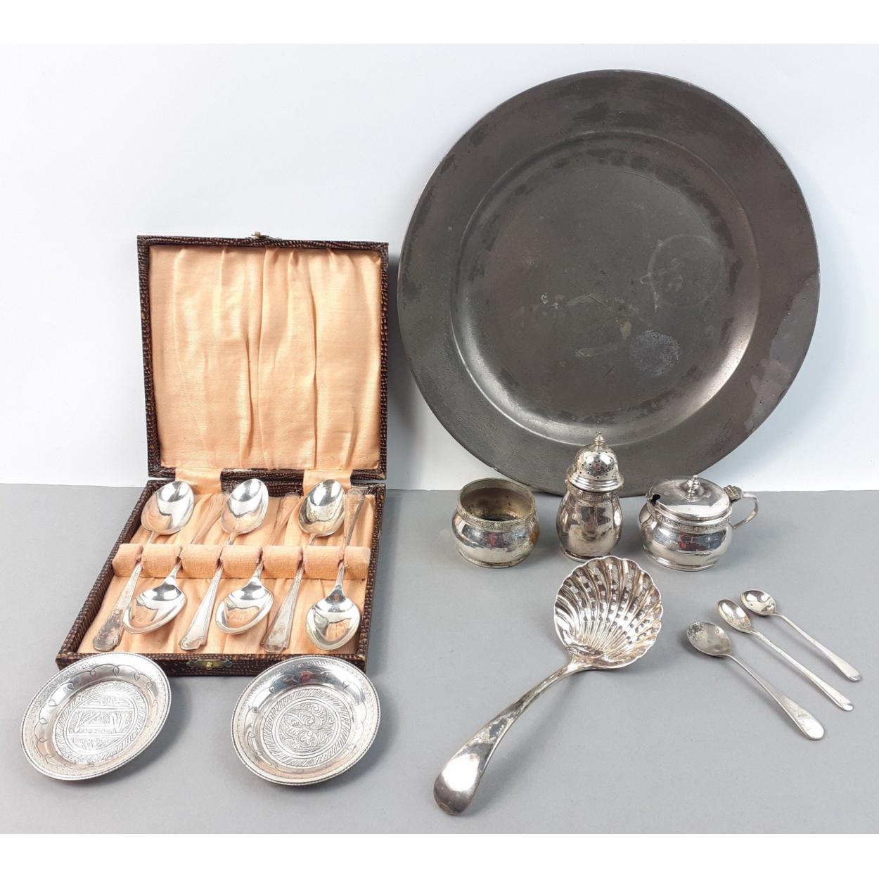 A small collection to include a pewter plate (25cm dia approx), a boxed set of 6 EPNS teaspoons, 3 condiment spoons, an EP strainer etc