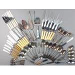 Five Venetian silver spoons with four other assorted plated spoons. Includes Mother of Pearl handled knife and Napoleon figural letter opener. Nice collection of useful quality flatware.
