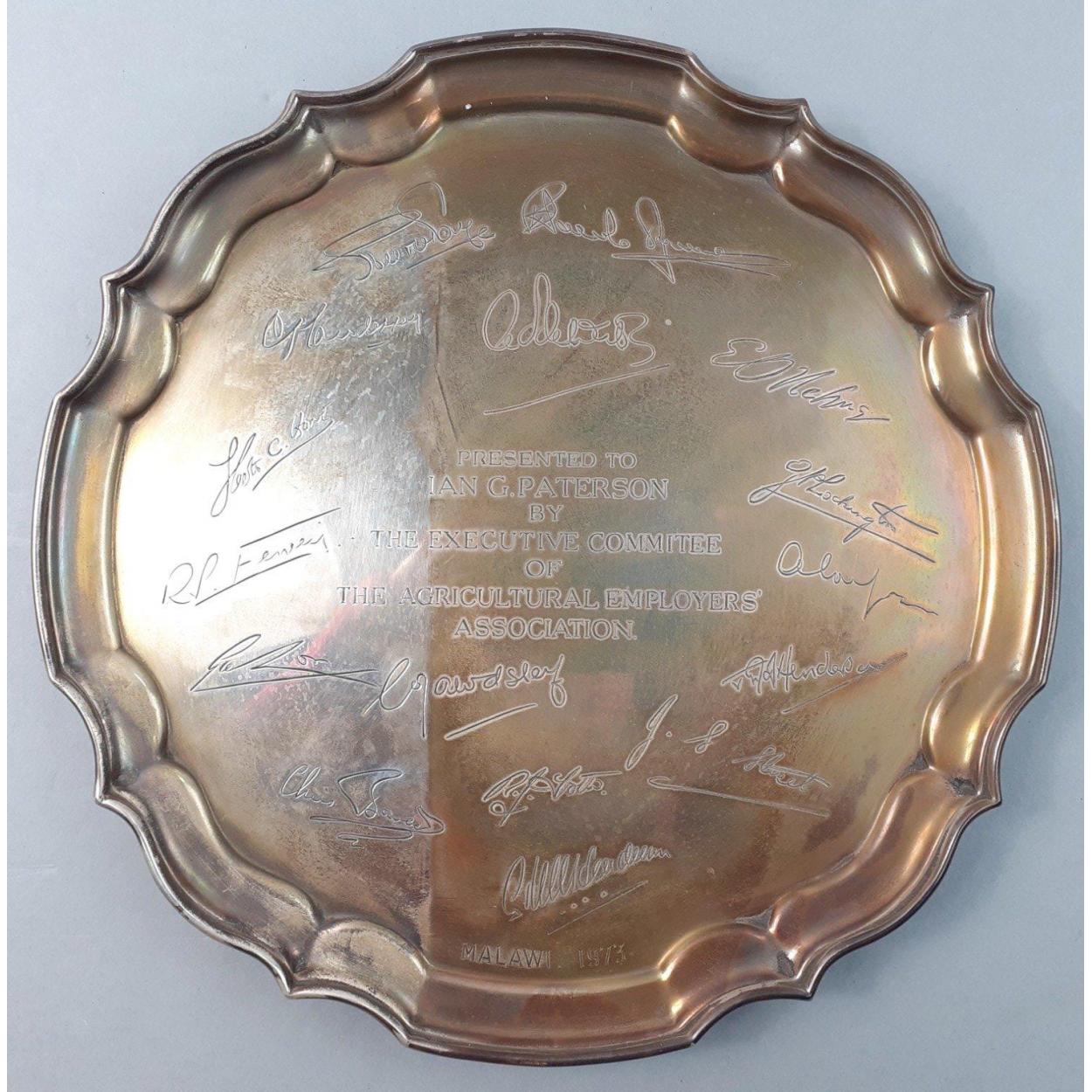 A super STERLING SILVER salver with BIRMINGHAM 1973. With contemporary Malawi Agriculture inscriptions and signatures to face. 25cm across approx. Sits on ball and claw style feet and weighs 465g approx