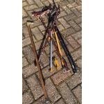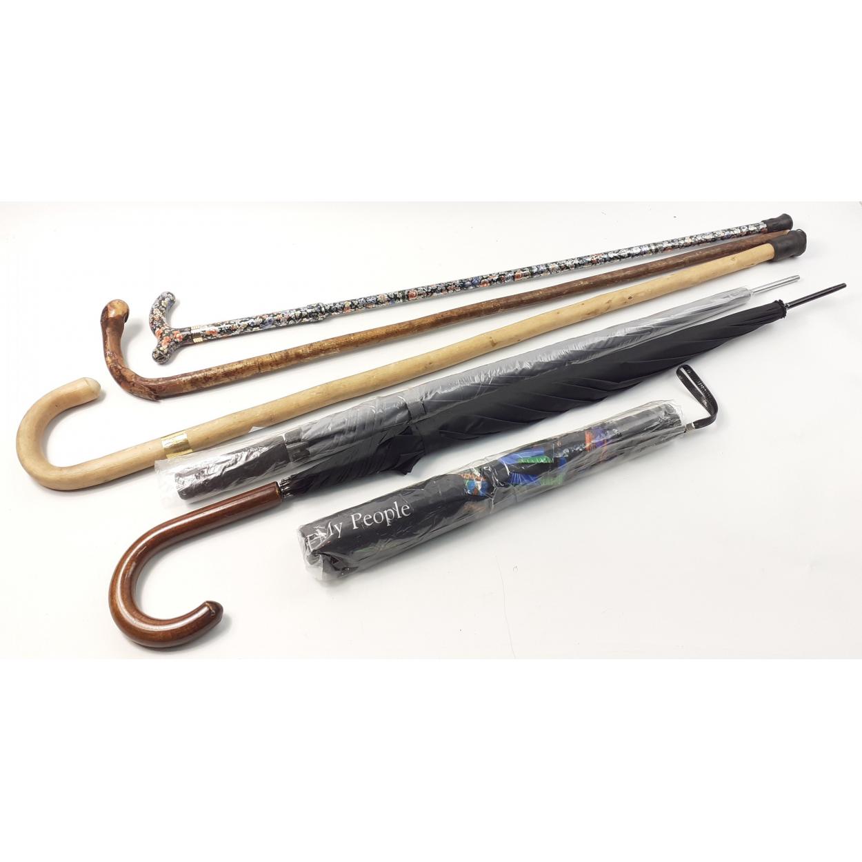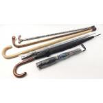A collection of walking sticks- two of which are VINTAGE & handmade (one BIRCH) to include an umbrella (new)