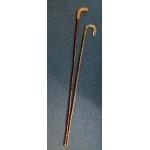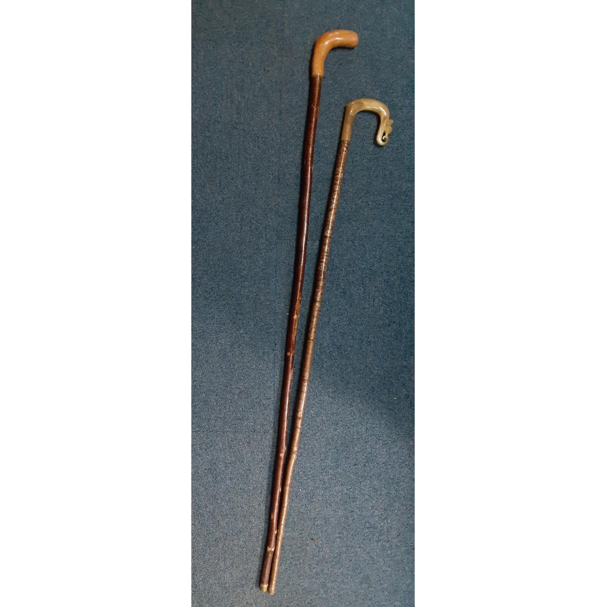 Two shepherd's crooks one horn-handled with thistle motif, the other oversized (144cm long) for chin resting and chin wagging