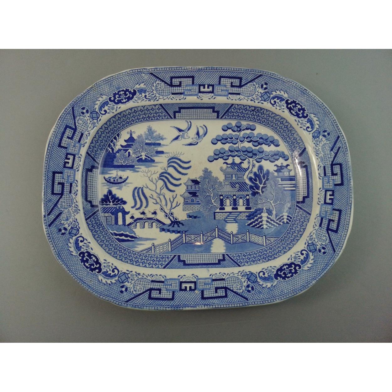 A super large blue and white antique meat server with Oriental willow pattern design, 45cm long