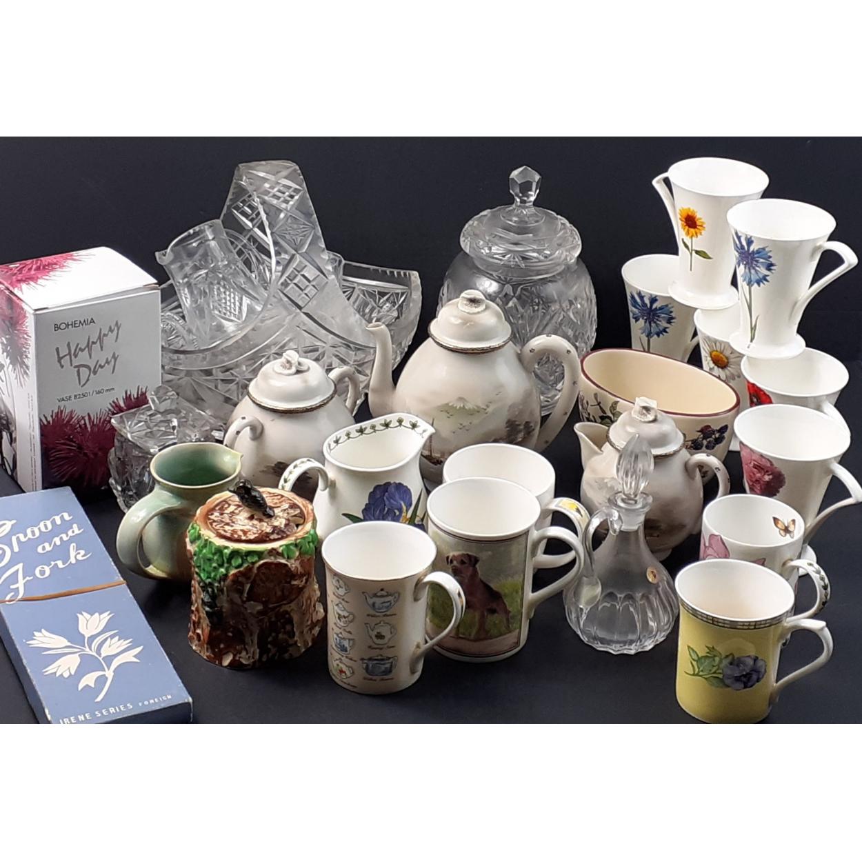 A mixed box to include some super quality cut crystal items i.e. fruit basket, cookie jar, some shot glasses, a collection of FINE BONE CHINA mugs and so much more!