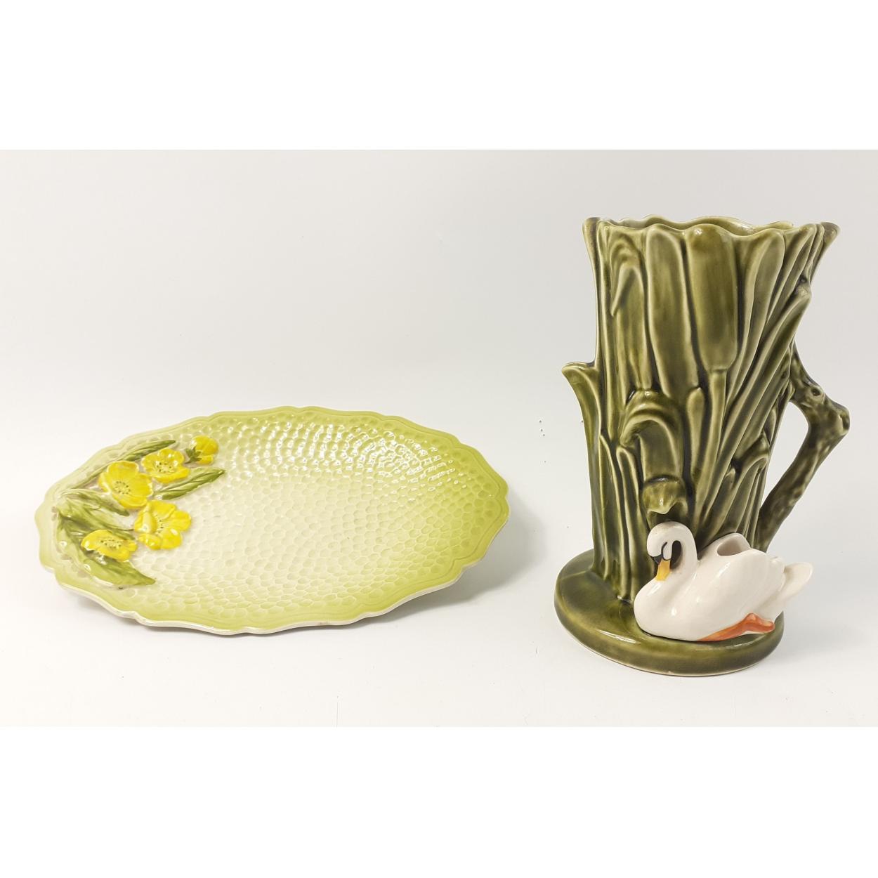 A very wonderful swan motif Sylvac spill vase- in very good condition with no damage - pattern number 4377. Standing 15 cm. Also a green dish with pretty yellow flowers.