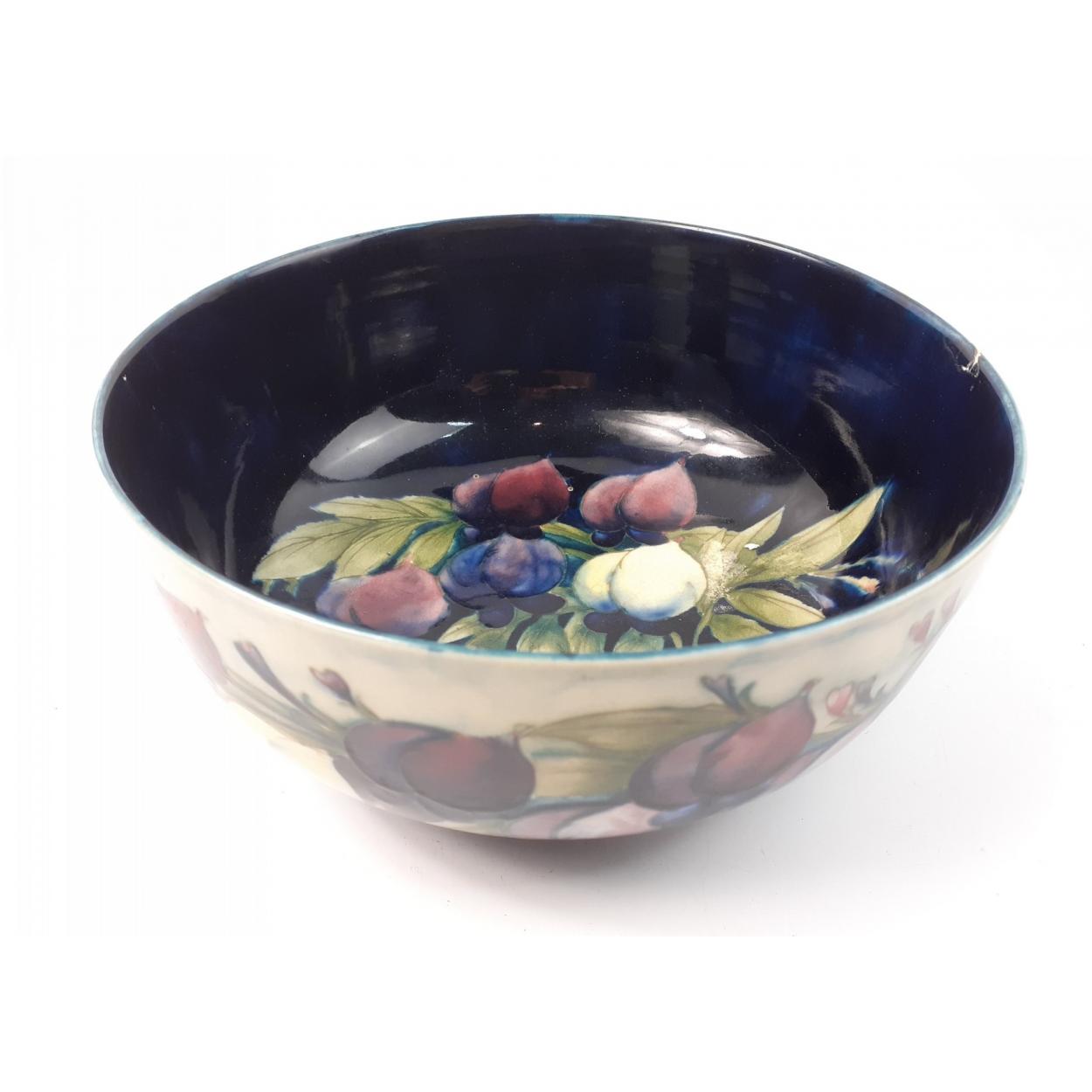 A large Moorcroft fruit bowl with Moorcroft signature on base. It is 24cm in diameter with an unfortunate 2cm chip to the rim.