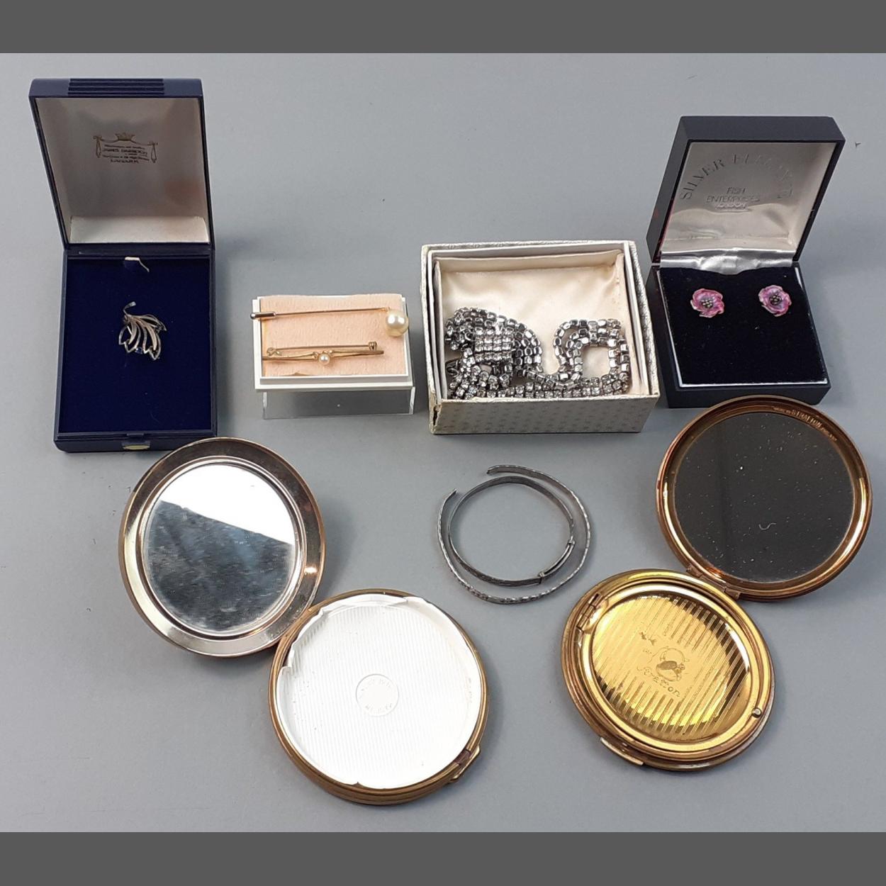 A small lot of mainly costume jewellery to include small silver bangle, a silver brooch, a lovely pair of floral earrings, two compacts and others.
