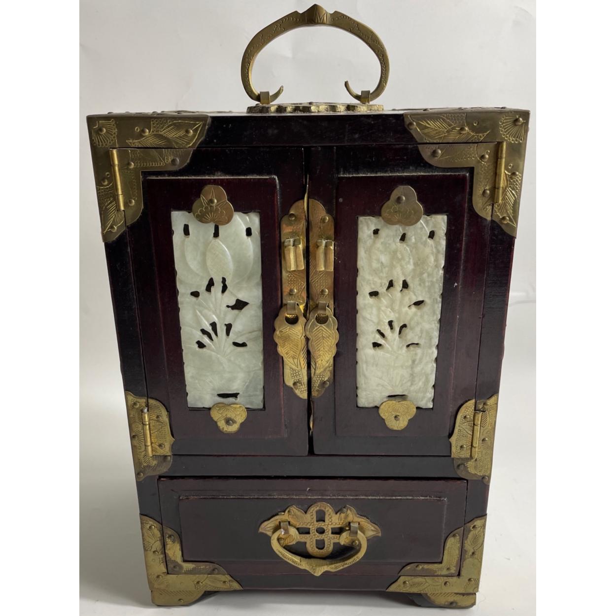 AN EXQUISITE CHINESE JEWELLERY CABINET in the traditional form with two jade panels within the twin doors, with three inner drawers lined in red satin, with a larger fourth drawer below the cupboard, with Chinese style escutcheon fittings - size 22cm high, 15cm across and depth 12cm
