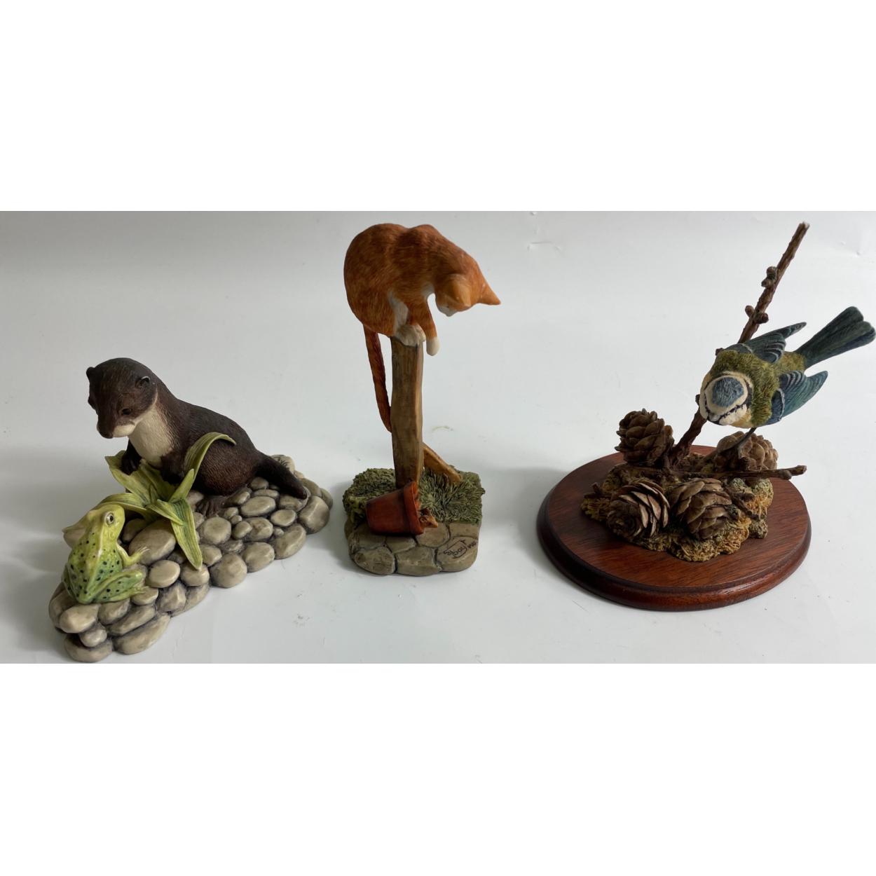 Three BORDER FINE ARTS pieces, two signed by RAY AYRES, Otter and Frog (1983), Bluetit on a twig with pine cones (1994?), and one by JUDY BOYT Cat on a pole with a mouse