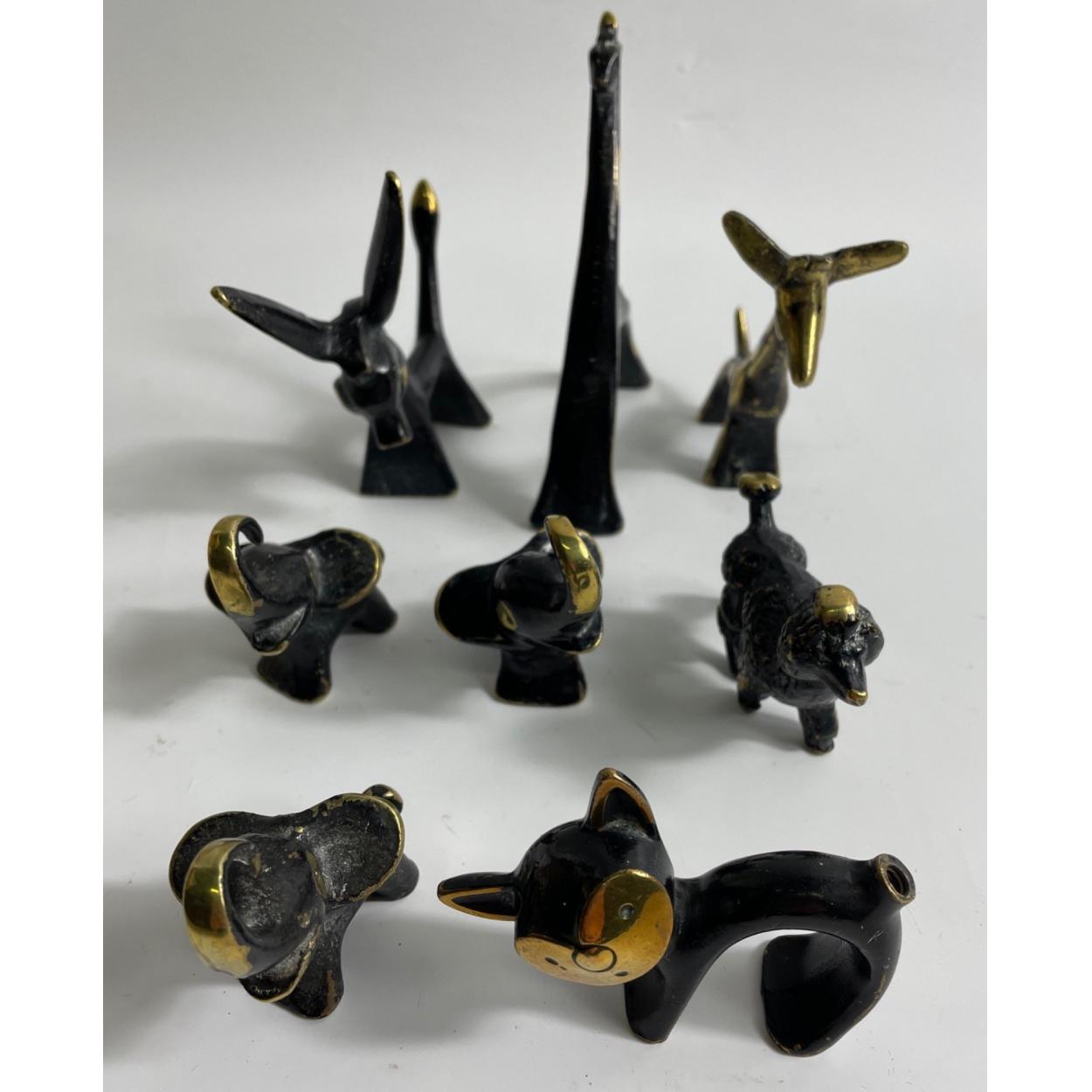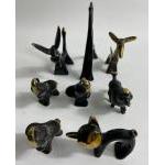 Eight vintage black painted animal figures to include a stylised giraffe, cat, donkey, elephants and poodle the tallest being approx 12cm.