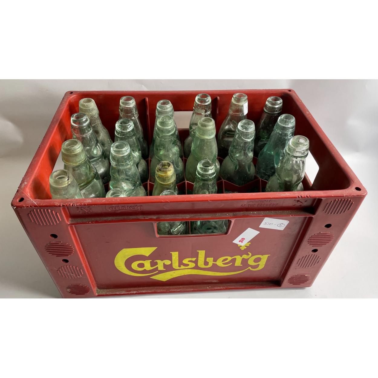 An ANTIQUE collection of 21 VINTAGE GLASS BOTTLES with MARBLE STOPPERS, some still retaining their rubber gasket to include such legends as SELLING OR USING THIS BOTTLE IS ILLEGAL, and THIS BOTTLE IS THE PROPERTY OF A MACKINTOSH & CAN NEITHER BE BOUGHT NOR SOLD, to include bottles from INVERNESS, DUMFRIES, NAIRN, LEITH, DALBEATTIE etc etc, all contained within a CARLSBERG 24 slot case.