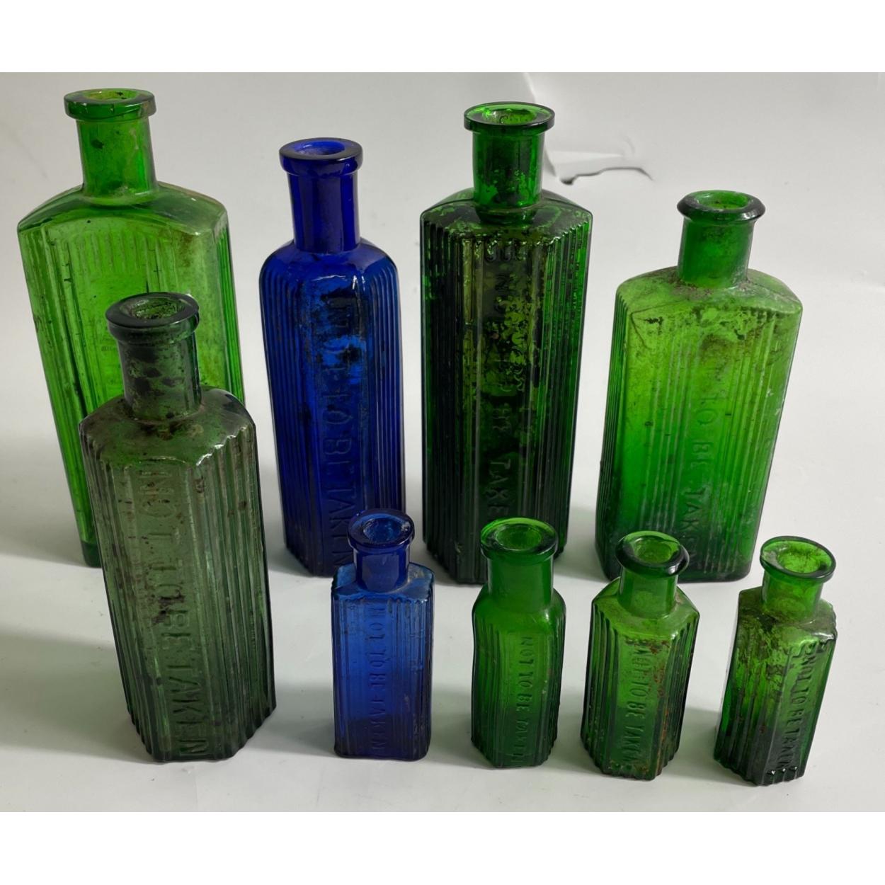 there is a smaller half bottle with yellowish staining on the neck which is cracked, also a couple or so larger bottkles with odd historical cracks but intact, the remaining in remarkably good worn condition. 21 bottles in total.