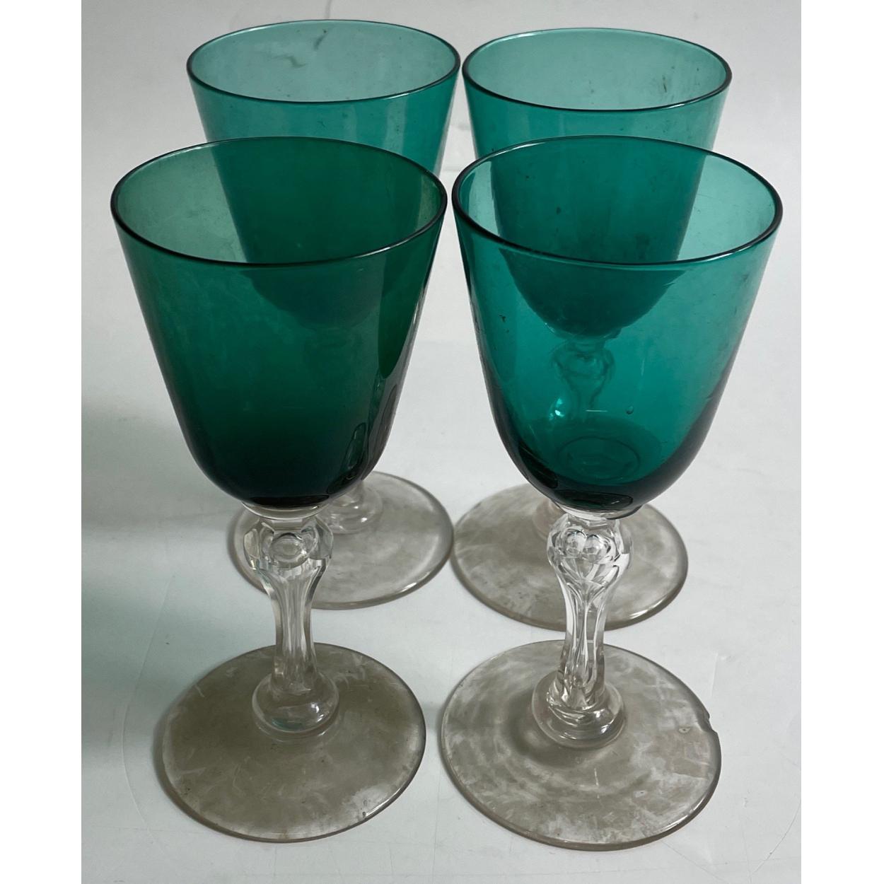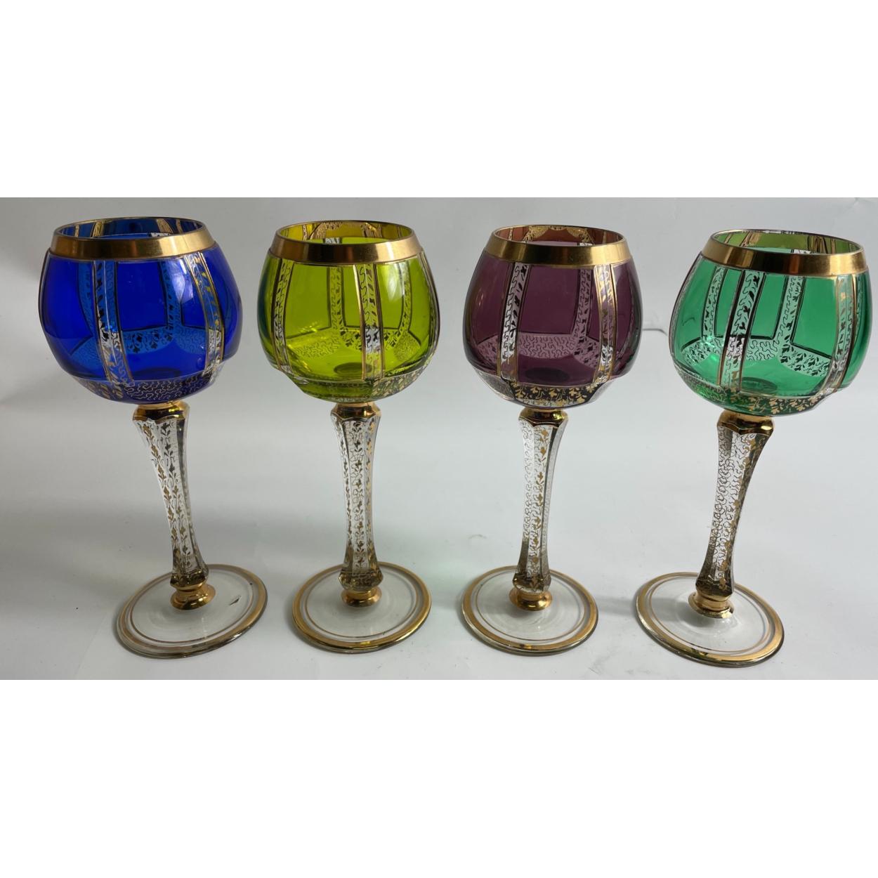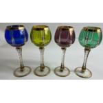 Four FINE tall WINE GLASSES (approx 22cm) in different jewel colours and gilt rims and stems - imagine them with candlelight shining through them on your dining table!