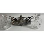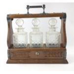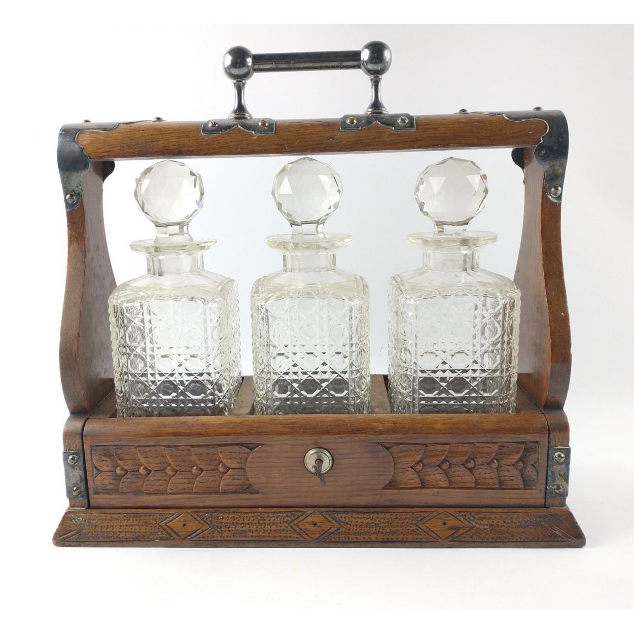 A LATE VICTORIAN TANTALUS with cut glass decanters with stoppers in place and EPNS stamped metal work still with original key 37cm long x 34cm tall x 13cm wide x decanters each 23cm tall ( one of the decanters has two chips out of the rim)