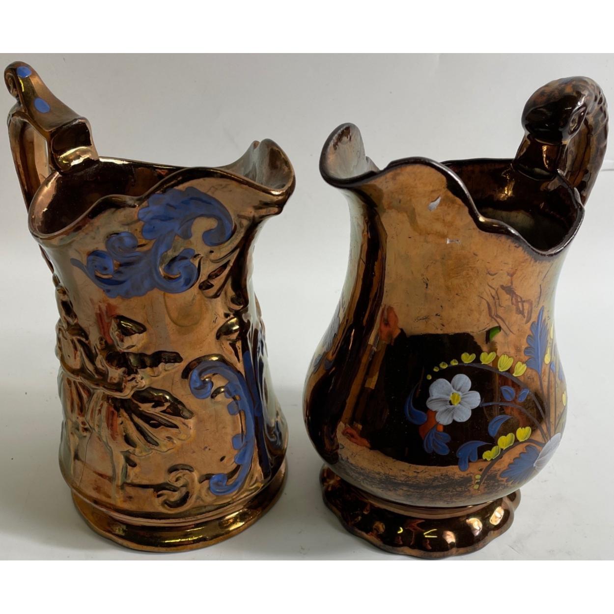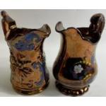 Two vintage LUSTRE CERAMIC JUGS one with a swan necked handle and a design of blue, white and yellow flowers , and the other has an embossed pictures of two figures dancing (both have a slight crack on the interior of the jug not visible from the outside), both stand approx 20cm tall.