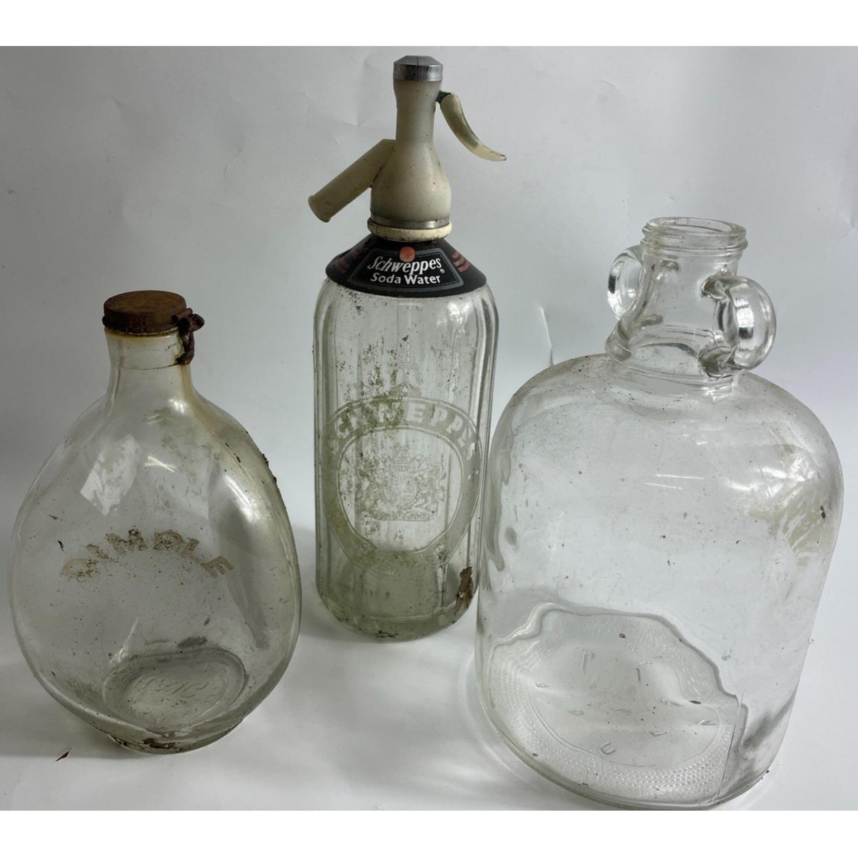 Vintage glassware to include an ETCHED SCHWEPPES SODA WATER SYPHON, a HAIG'S DIMPLE bottle and a HALF-SIZED demi-john.