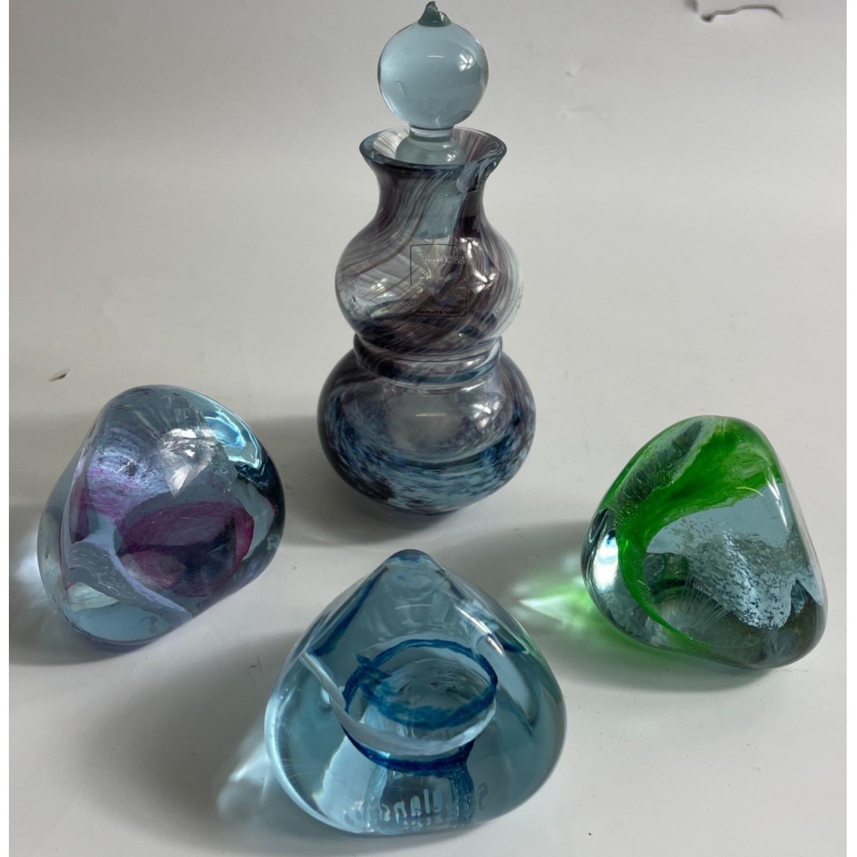 THREE CAITHNESS GLASS PEBBLES plus 1 perfume bottle (approx 13cm), small chip from rim and from top of stopper).
