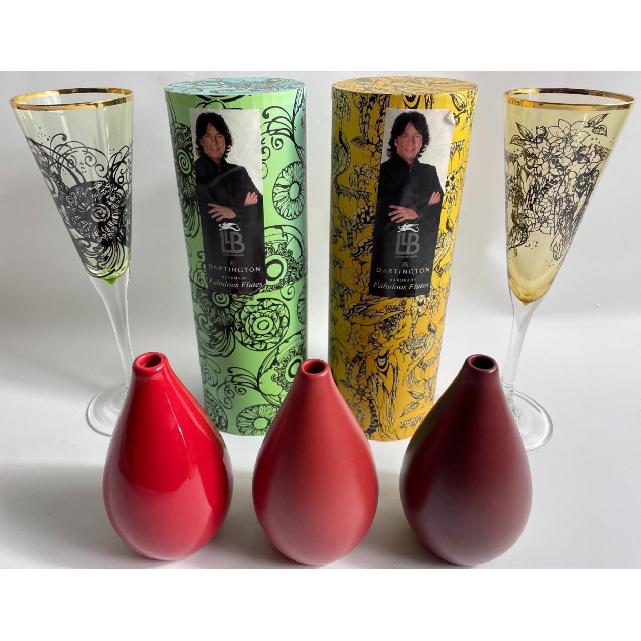 Two unused DARTINGTON champagne flutes by LAWRENCE LLEWELLYN BOWEN unused items and a set of three small smart stem vases, again as new still in packaging.