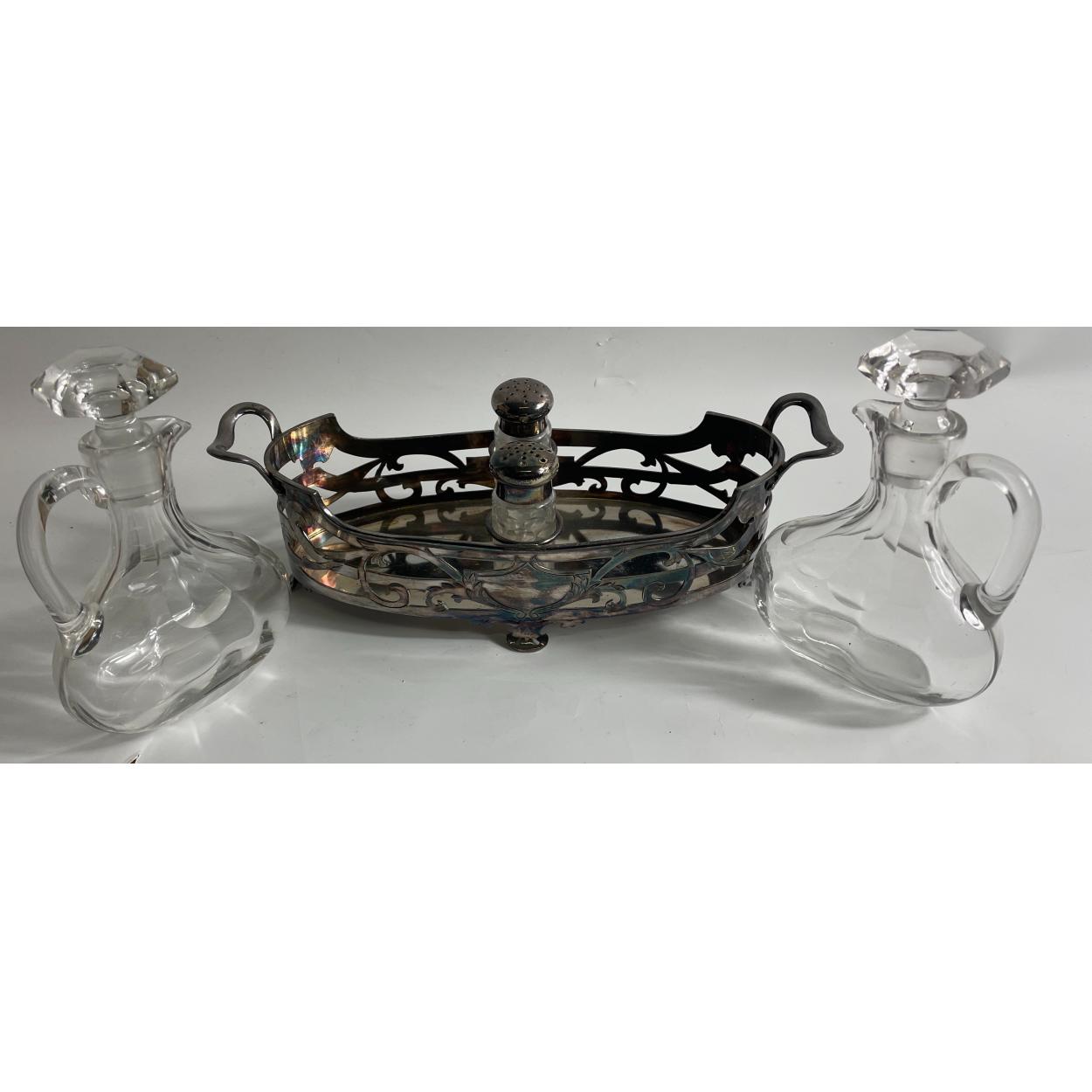 A nice wee VINTAGE CONDIMENT set with cut glass oil and vinegar bottles with glass stoppers 14cm talk and a salt and pepper set