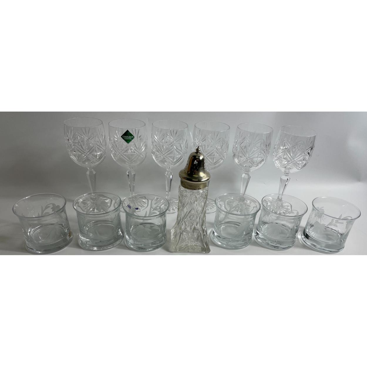 VINTAGE EPNS topped crystal sugar sifter 17cm height, with also 6 whisky tumblers with a nice floral design( unused new condition) with also 6 EDINBURGH CRYSTAL wine glasses