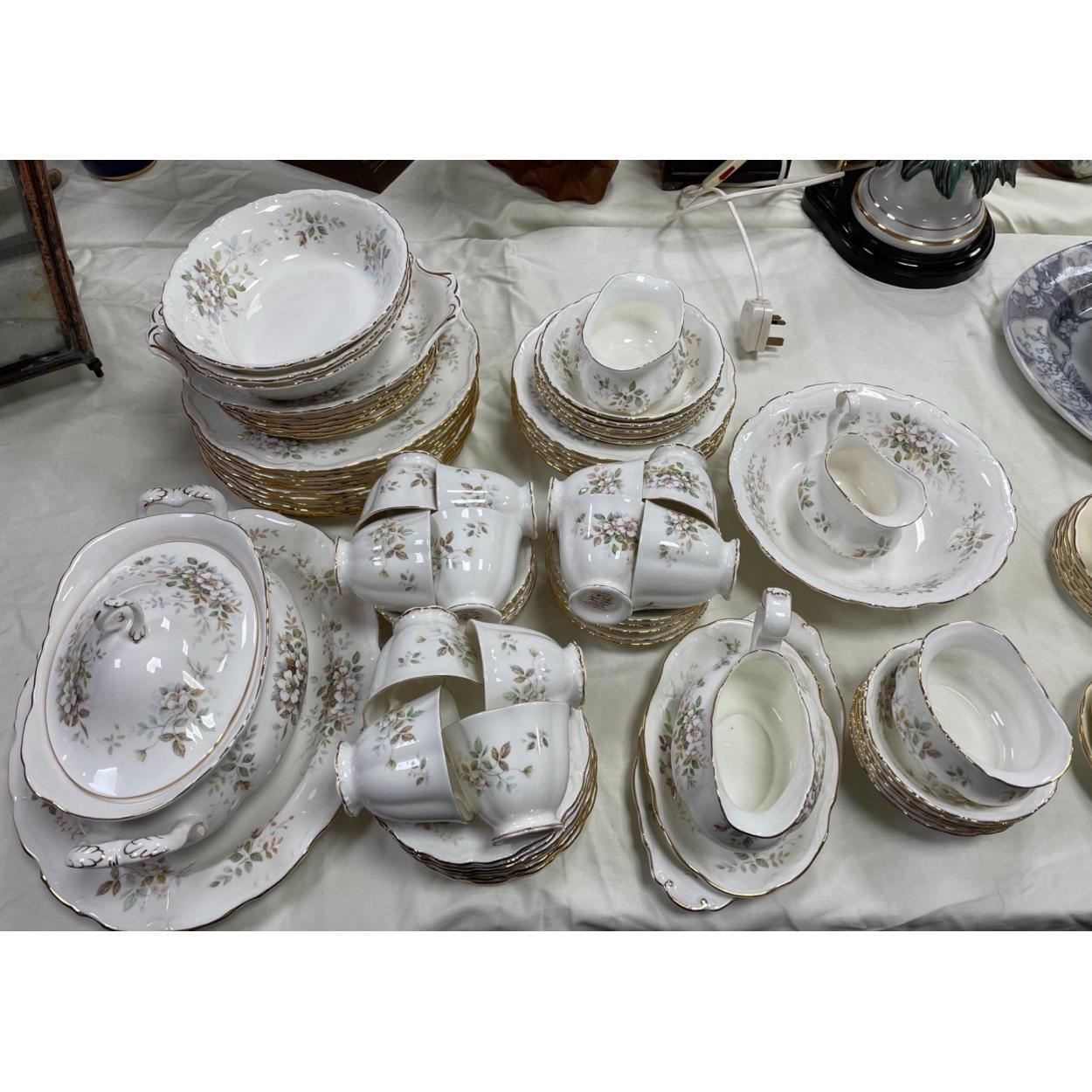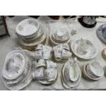 ROYAL ALBERT HAWORTH dinner service to include 12 teacups, 12 saucers @ 14cm, 12 plates @16cm, 6 plates @ 20cm, 11 plates @ 26cm, 6 bowls @14cm, 5 bowls @15cm, 6 bowls @20cm, 1 serving dish @24cm, 1 sauceboat @18cm with underplate, 1 milkjug @13cm with 2 sugar basins @12cms with underplate of 26cm, 1 sandwich plate @ 26cm, 1 lidded vegetable tureen @28cm with underplate @35cm,