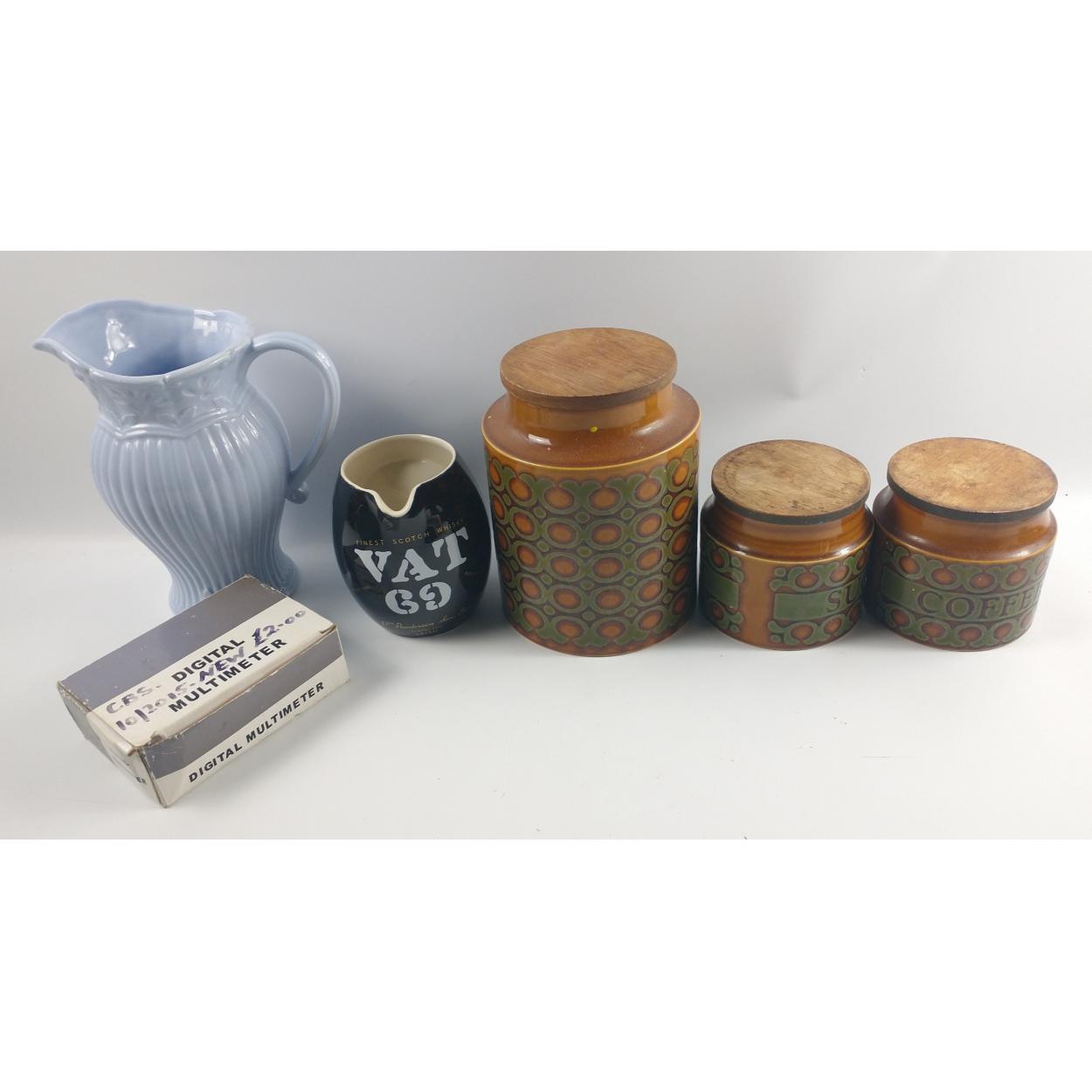 A vintage WADE REGICOR VAT 69 water jug, plus a set of vintage 1970s HORNSEA STORAGE JARS the largest at 20cm plus 2 more labelled 'sugar' and 'coffee' at 10cm as well as a Grecian style jug at approx 23cm tall and a MULTIMETER.