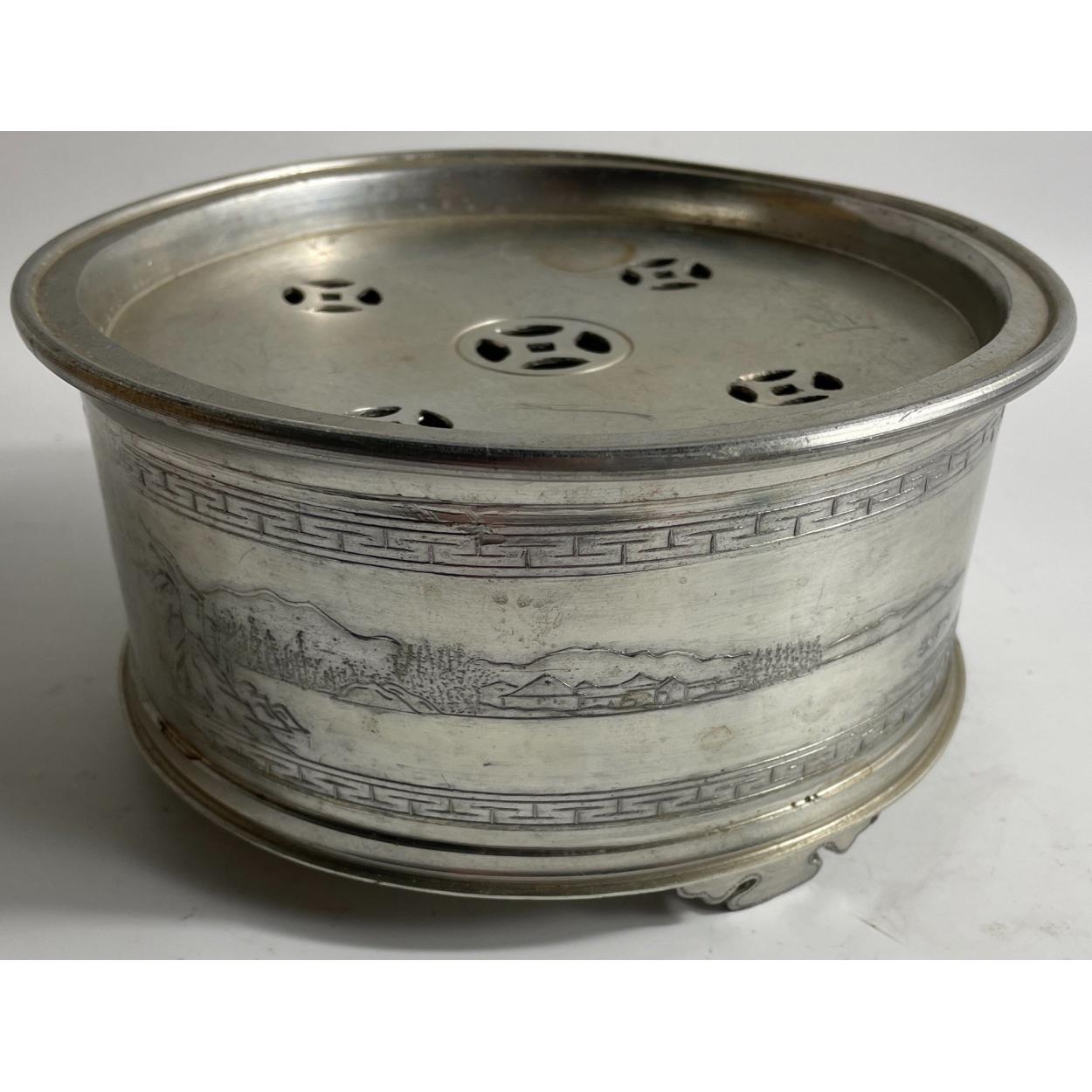 A quality CHINESE white metal food warmer with detachable lid, with interesting pattern inscription and traditional mountain scenes 17cm diameter x 9cm high approx