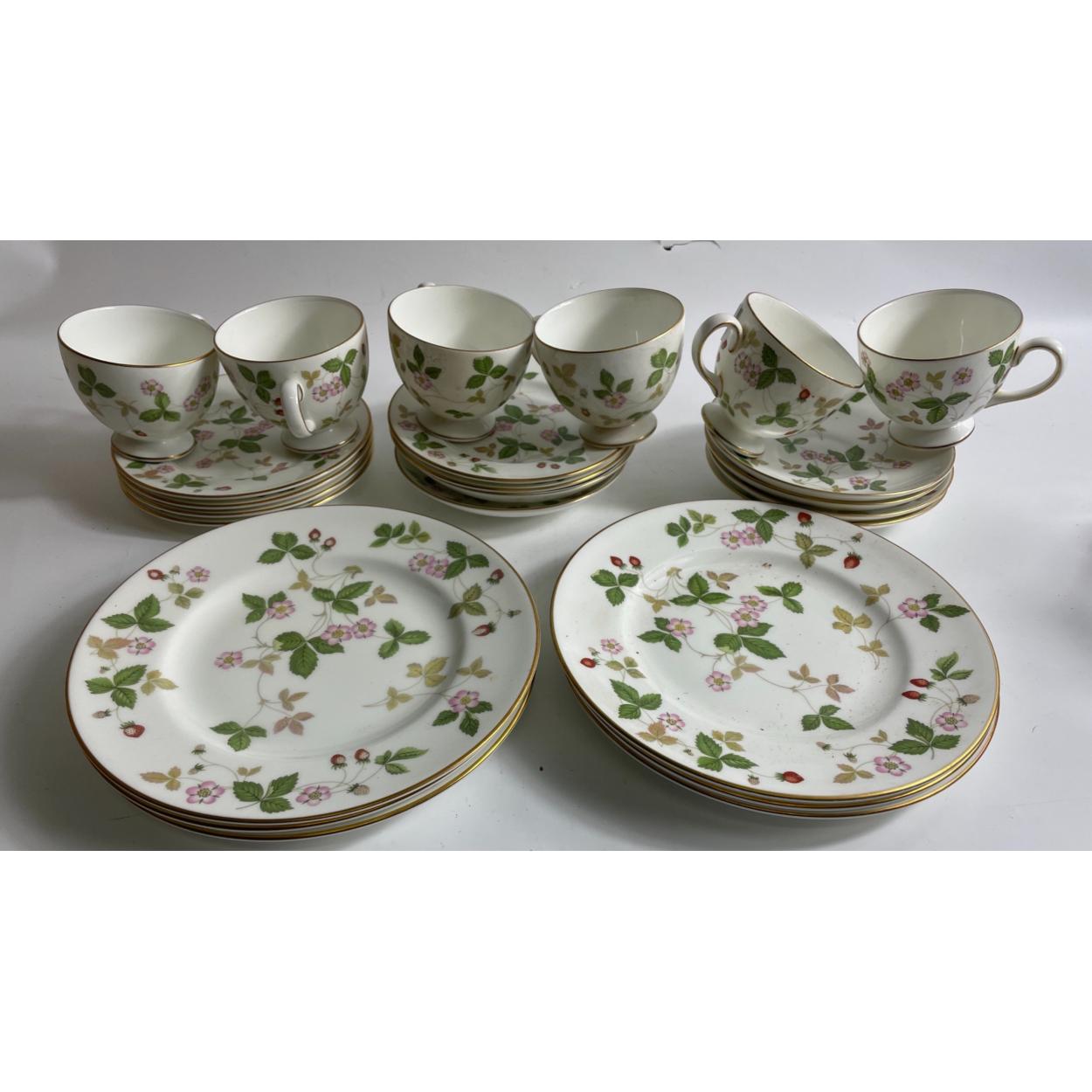 A part WEDGWOOD WILD STRAWBERRY tea service to include 6 x 20cm side plates, 6 x 15cm side plates, 6 saucers, 6 teacups (1 has a small chip in the rim)