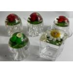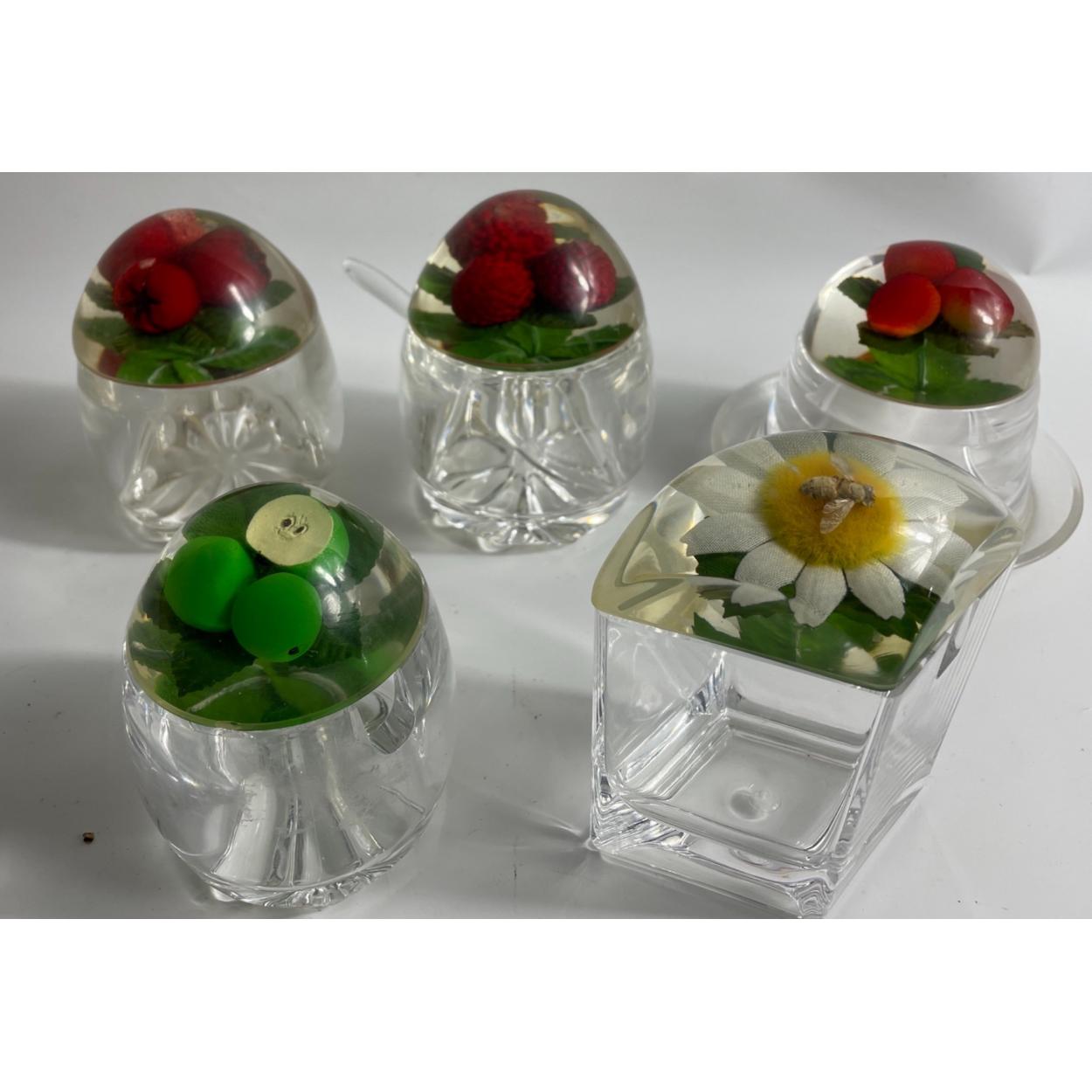Five 1960's PERSPEX LUCITE FRUIT JAM POTS the largest being the RASPBERRY pot with original spoon (13cm approx), also STRAWBERRY pot with drip catching lip as well as CHERRY and APPLE and a diamond-shaped one for HONEY.