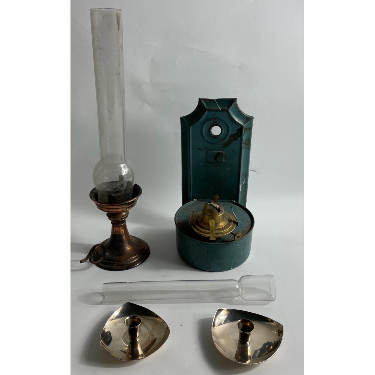 Small mixed lot containing a lovely pair of Kronen Denmark Mid Century Modernism Silver Plated Candle Holders approx. 8cm wide x 2.5cm tall, a very old copper Wee Willy Winkie or “go-to-bed” candle holder a nice blue enamel on tin wall hanging Oil lamp with wick and 2 small glass oil lamp chimneys
