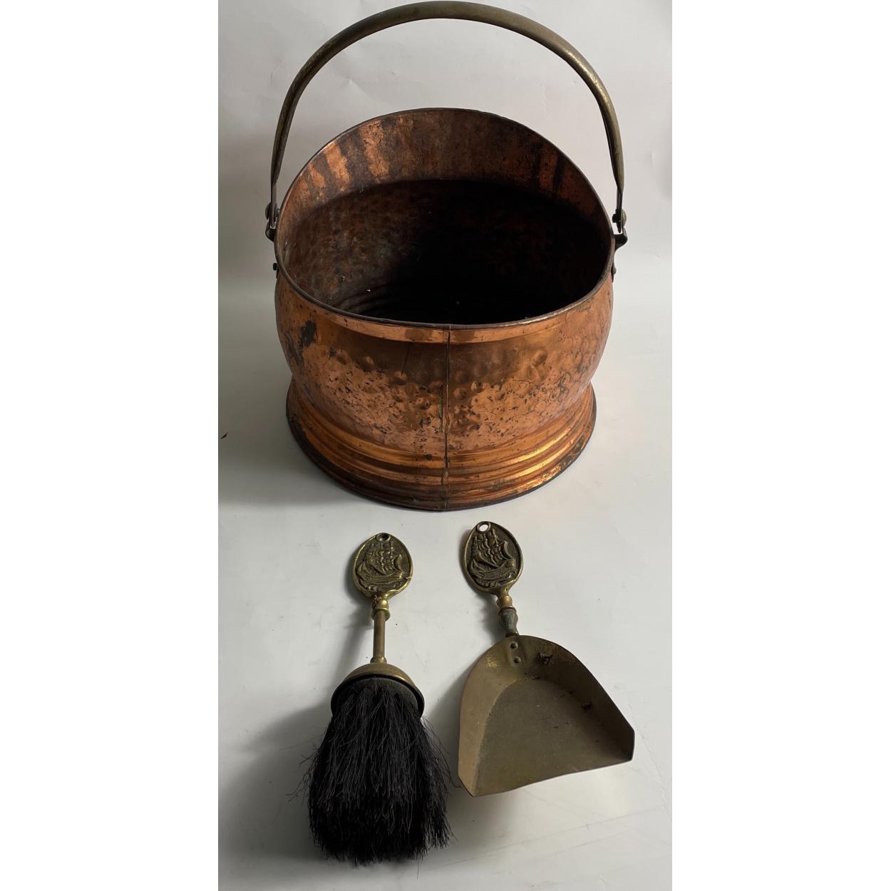 A nice old copper coal pail with brass style handle with a fireside brass brush small shovel and poker