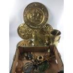 A large box of MIXED VINTAGE BRASS ITEMS to include 3 antique repousse brass wall plates, the largest approx 40cm.
